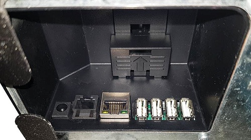 Имеет 4 порта USB, Ethernet-порт и порт для подключения автоматического денежного ящика.