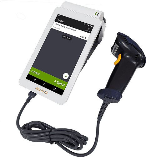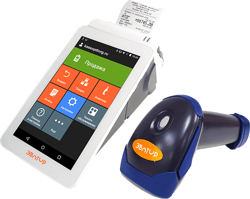 Популярный онлайн кассовый аппарат на основе планшета со встроенным фискальным накопителем на 15 месяцев и в комплекте со сканером 2D штрих-кодов.